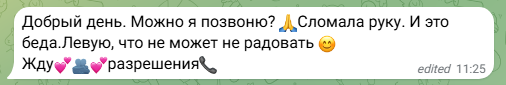 «Можно я позвоню? 🙏 Сломала руку. И это беда. Левую, что не может не радовать 😊 Жду 💓 Разрешения 📞»