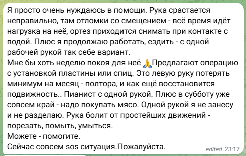 «Я просто очень нуждаюсь в помощи. Рука срастается неправильно, там отломки со смещением — всё время идёт нагрузка на неё, ортез приходится снимать при контакте с водой. Плюс я продолжаю работать, ездить — с одной рабочей рукой так себе вариант. Мне бы хоть неделю покоя для неё 🙏 Предлагают операцию с установкой пластины или спиц. Это левую руку потерять минимум на месяц-полтора, и как ещё восстановится подвижность. Пианист с одной рукой. Плюс в субботу уже совсем край — надо покупать мясо. Одной рукой я не занесу и не разделаю. Рука болит от простейших движений — порезать, помыть, умыться. Можете — помогите. Сейчас совсем SOS-ситуация. Пожалуйста». 23:17