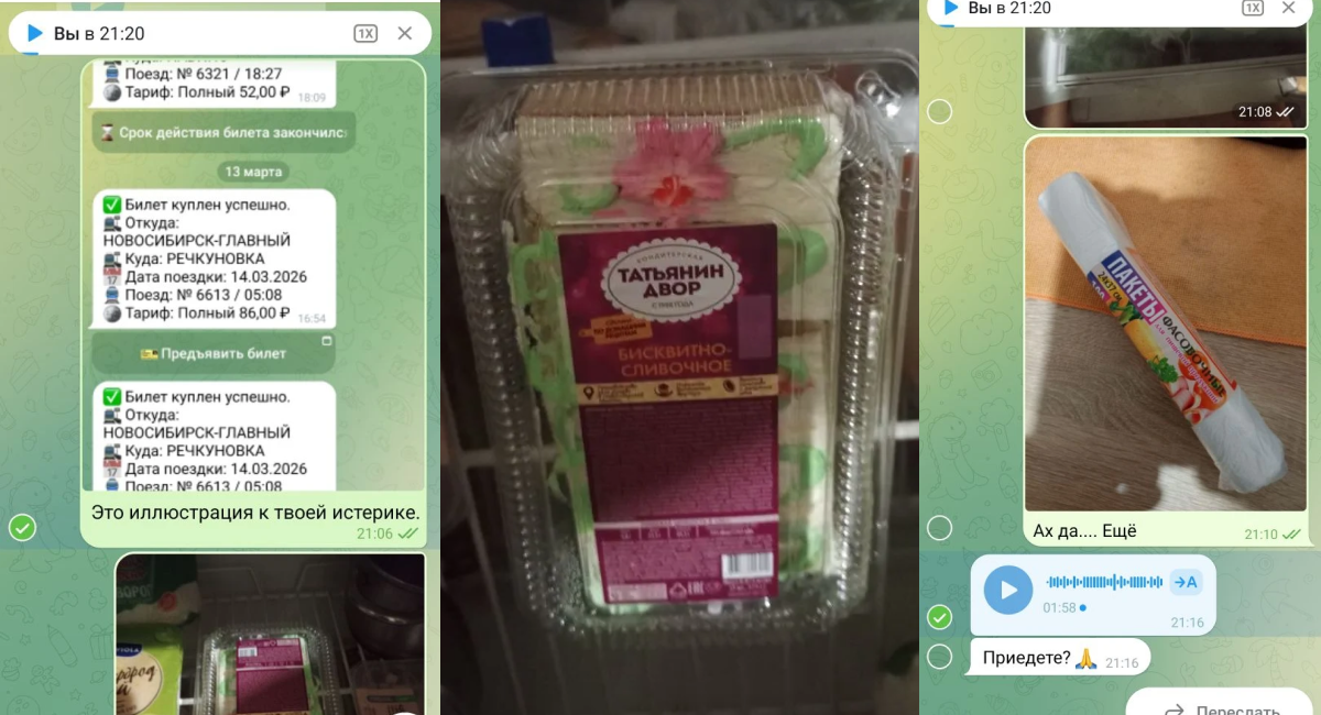 Я отправил скрины наших с Дашей билетов на электричку. Дата и время приобретения — задолго до этого разговора. Фото пирожных. Фото упаковки пакетов.
