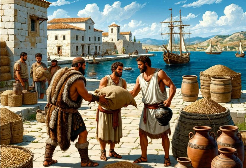 Пример: Представьте, что вы скифский вождь и меняете мешок пшеницы на красивую греческую вазу. Вот так и жили.